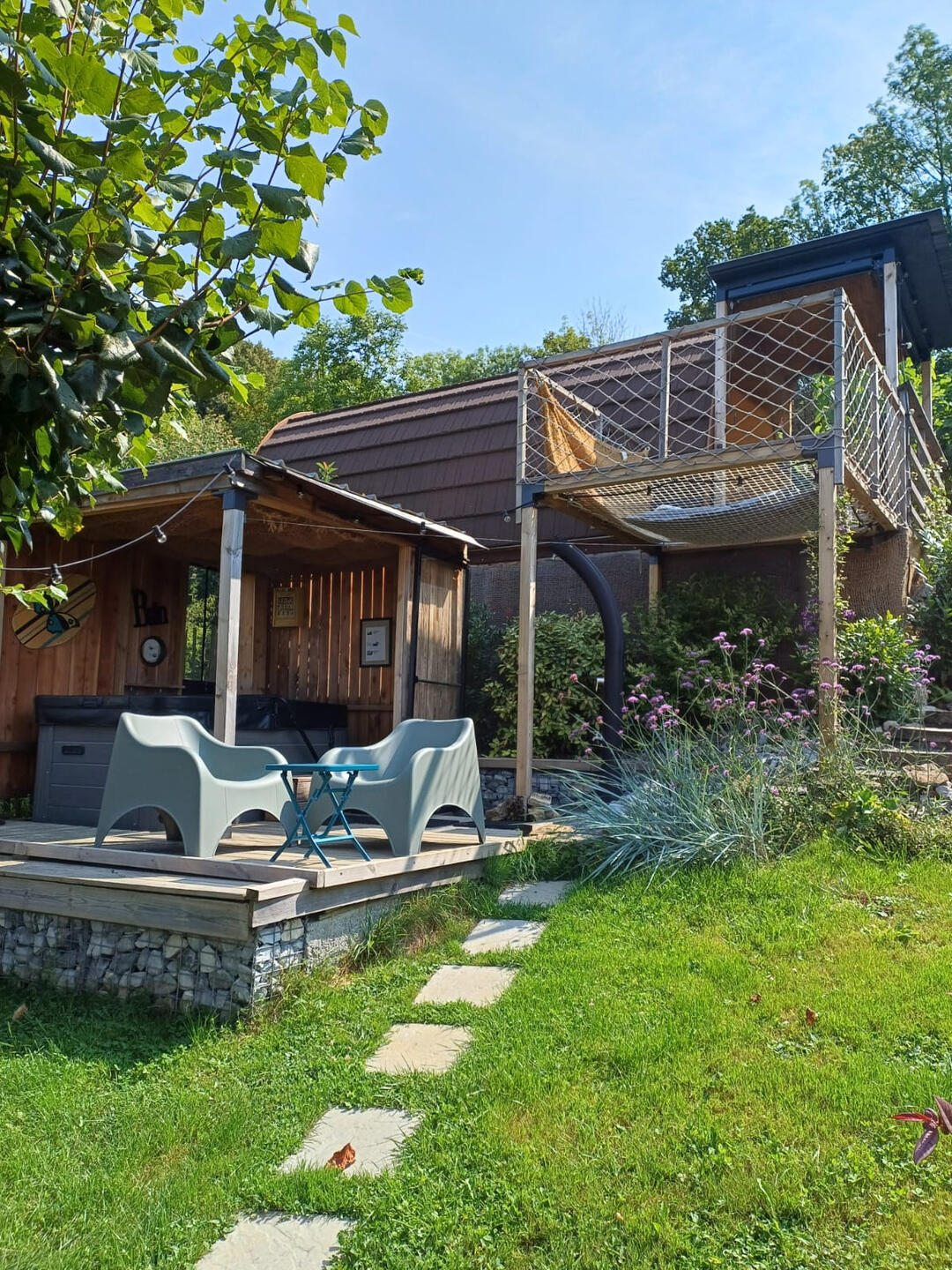 Moderne et chaleureux, avec tout le confort pour se sentir comme à la maison.Deux terrasses vous attendent, dont une avec jacuzzi privatif chauffé toute l’année à 38°, offrant une vue paisible sur le vallon.En option : un authentique grill finlandais (kota) pour des repas conviviaux au coin du feu (30€).Idéalement situé, à seulement :